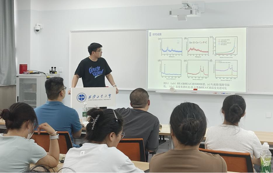 活动过程中,三位优秀研究生代表依次带来精彩的学术分享。2024级博士研究生牛佳林以“助熔剂法生长的钛酸铋钠基单晶的超高电致应变”为题,系统阐述了钛酸铋钠基单晶的制备工艺、性能优势及潜在应用场景,展现其在新型电子器件领域的研究价值;2023级硕士研究生关畅澎围绕“准同型相界附近Bi0.5Na0.5TiO3-PbTiO3单晶的结构与电学性能研究”,深入剖析相界行为对单晶电学性能的影响机制及优化路径,为智能传感器材料开发提供创新思路;2024级硕士研究生李庆根以“高熵合金与石墨复合作为提高锂离子电池性能的新策略”为主题,介绍复合材料的制备方法、性能测试结果及在储能领域的应用前景,引发在场同学的广泛关注与热烈讨论。
