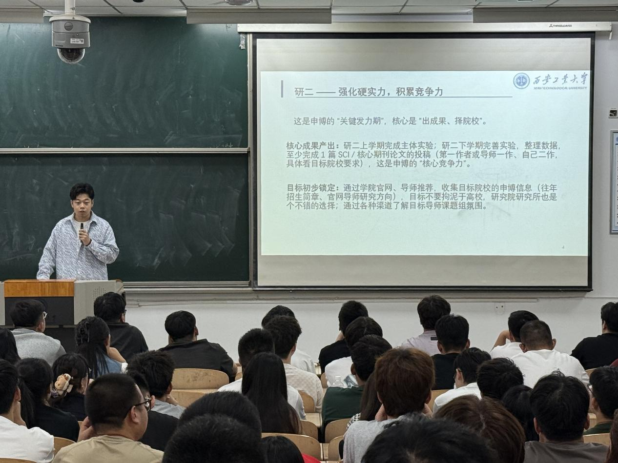 学科特色,拆解不同方向的能力储备重点,帮助新生建立“目标倒推”思维;随后特邀成功升博的学长分享经验,从“博士申请时间线规划”“科研论文写作技巧”“导师沟通与学术资源获取”等实用维度展开。在现场互动问答环节,针对性解答新生“科研入门难点”“读博适配性判断”等疑问。现场新生纷纷表示,通过提前了解生涯规划框架、吸取学长实战经验,不仅缓解了新生入学的迷茫,更明确了入学初期的重点努力方向。