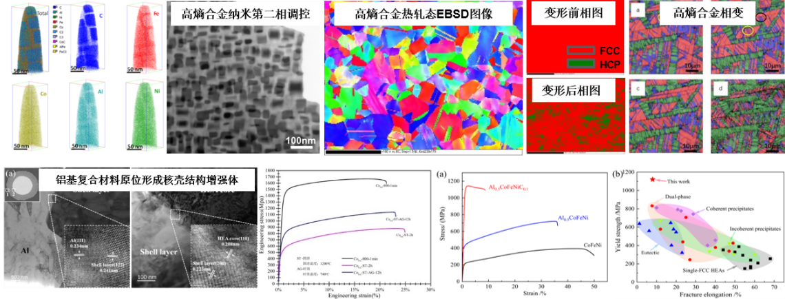 通过调控纳米析出相、TWIP效应、TRIP效应以及层错,获得高强韧高熵合金(屈服强度接1500MPa、拉伸塑性接近25%)。提出高熵合金增强金属基复合材料,原位形成核壳结构高熵合金增强体,实现了复合材料强度和塑性同时提高。