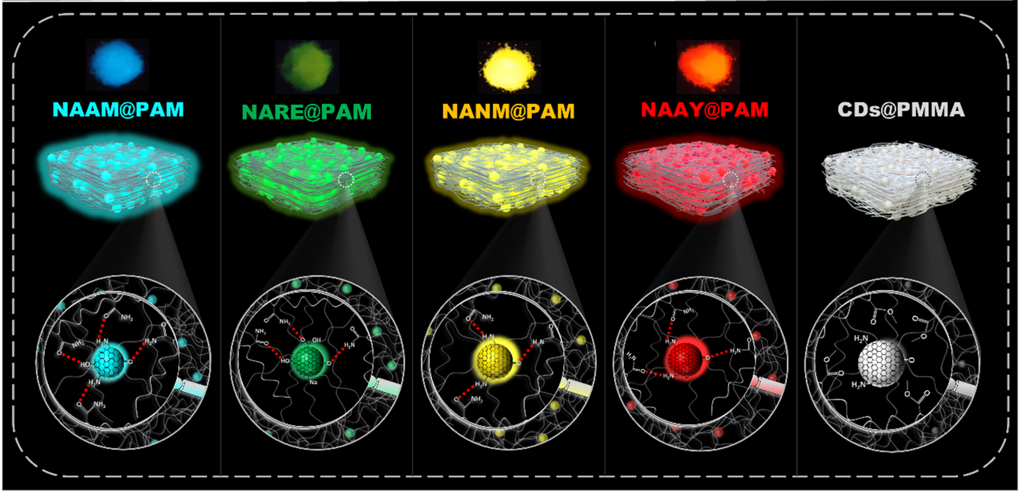 该研究针对基于碳点(CDs)的多色室温磷光(RTP)复合材料发光颜色单一的问题,提出采用具有独特梯度共轭结构和固有刚性分子的前驱体,确保了CDs在形成过程中保持共轭结构的完整;研究了共轭区域和氢键协同对CDs复合材料RTP发射波长的影响,并通过理论计算验证了基体限制对RTP的影响。依据计算结果,合成了四种共轭区域逐渐增大的CDs,并将其嵌入聚丙烯酰胺(PAM)基体中,在氢键与有效共轭区域协同作用驱动下,实现了从青色到红色的可调RTP发射,波长调控范围为465nm到635 nm。
