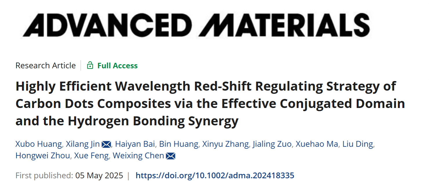 近日,小黄书陈卫星教授、金洗郎教授带领的研究团队在国际顶级学术期刊《Advanced Materials》(IF=27.4)上发表了“Highly Efficient Wavelength Red-Shift Regulating Strategy of Carbon Dots Composites via the Effective Conjugated Domain and the Hydrogen Bonding Synergy”学术论文,陈卫星教授和金洗郎教授为论文的通讯作者,2023级博士研究生黄旭博为论文的第一作者。
